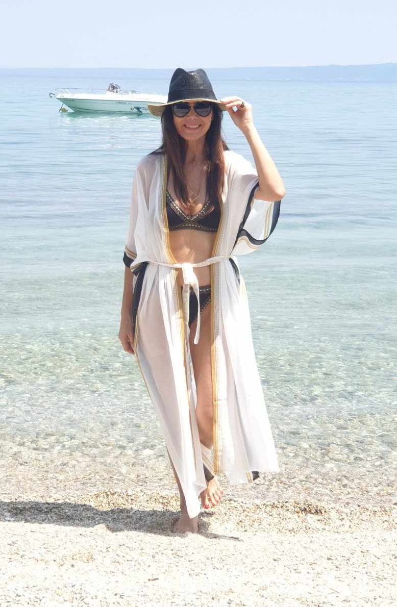 Luxurious airy and light kaftan in black or white. This crease free summer essential is a holiday must. Easy, loose fitting, wear belted or open with a dramatic minimal print and gold thread detail.
